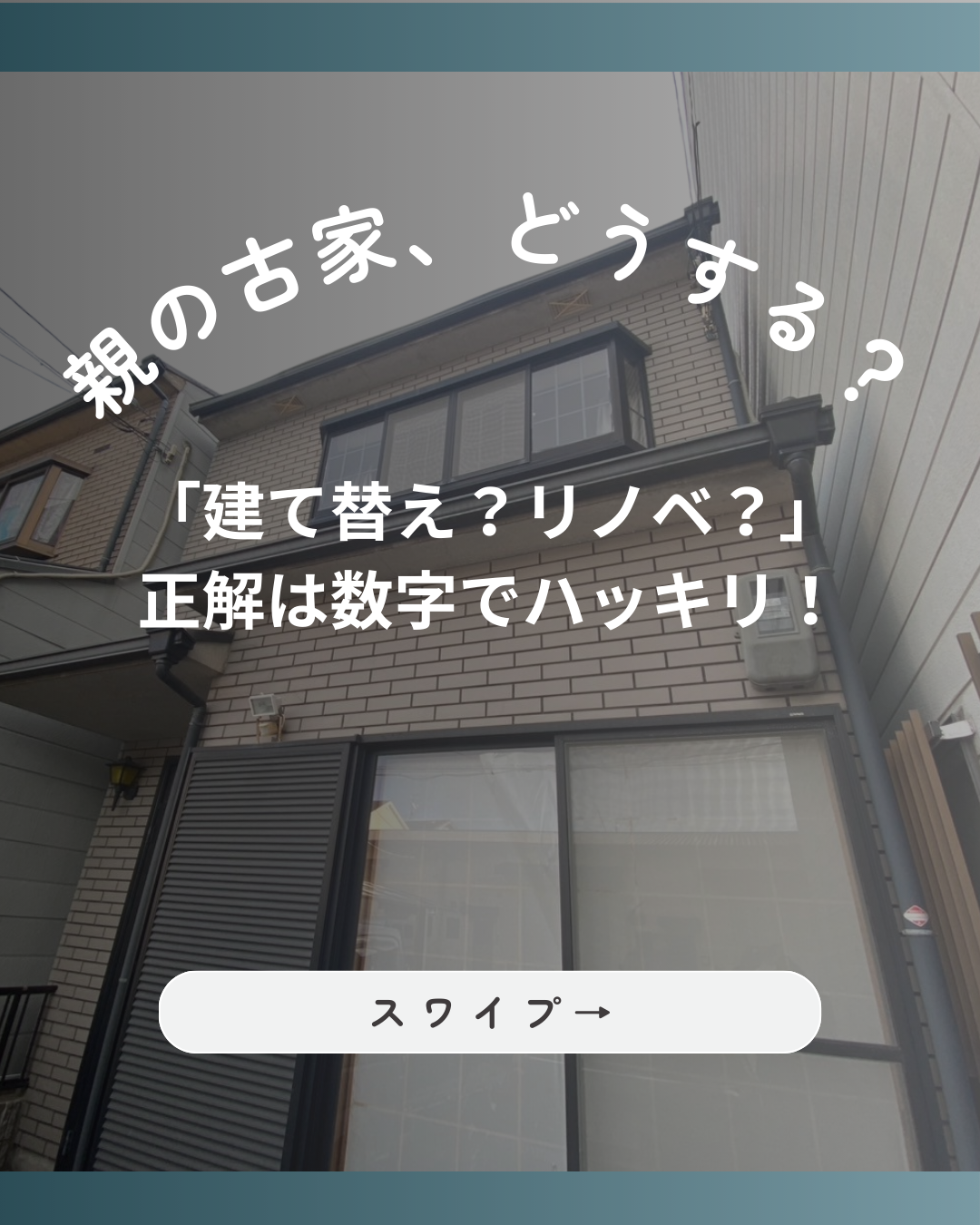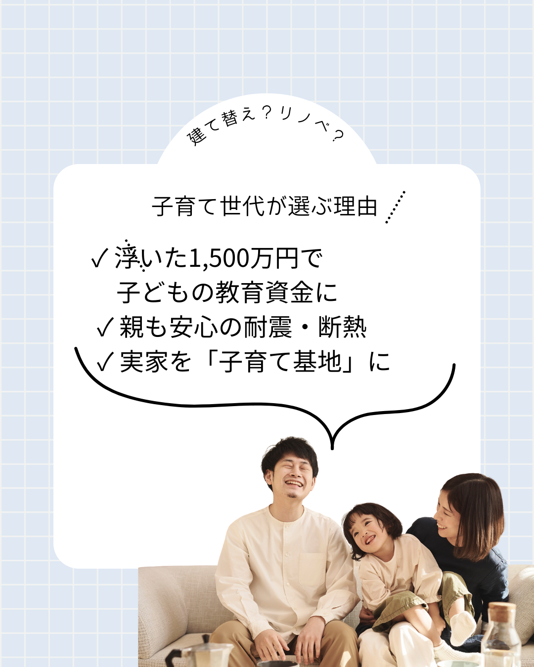 親の古家をどうしようか悩む30〜40代の子育て世代の方へ。「建て替えが高すぎる…」「リノベで本当に耐震・断熱が新築並み?」という疑問に、耐震性能2倍・断熱性能2倍の実績数字で具体的に答えます。