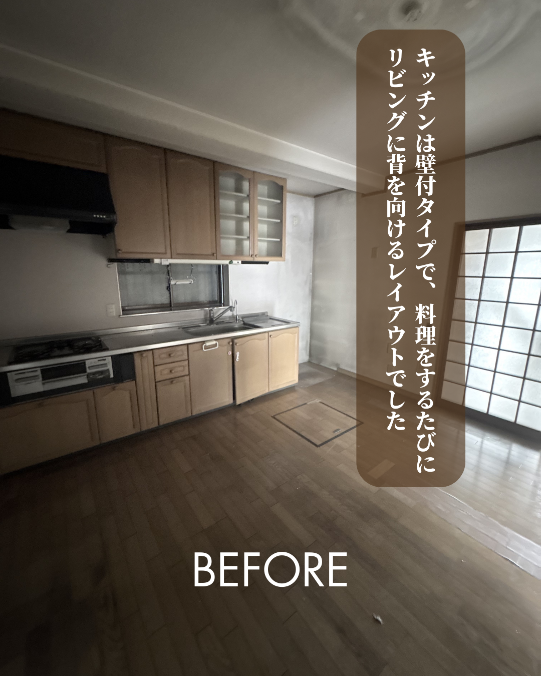 リノベーション前は、壁付のキッチンでリビングに背を向ける配置。
