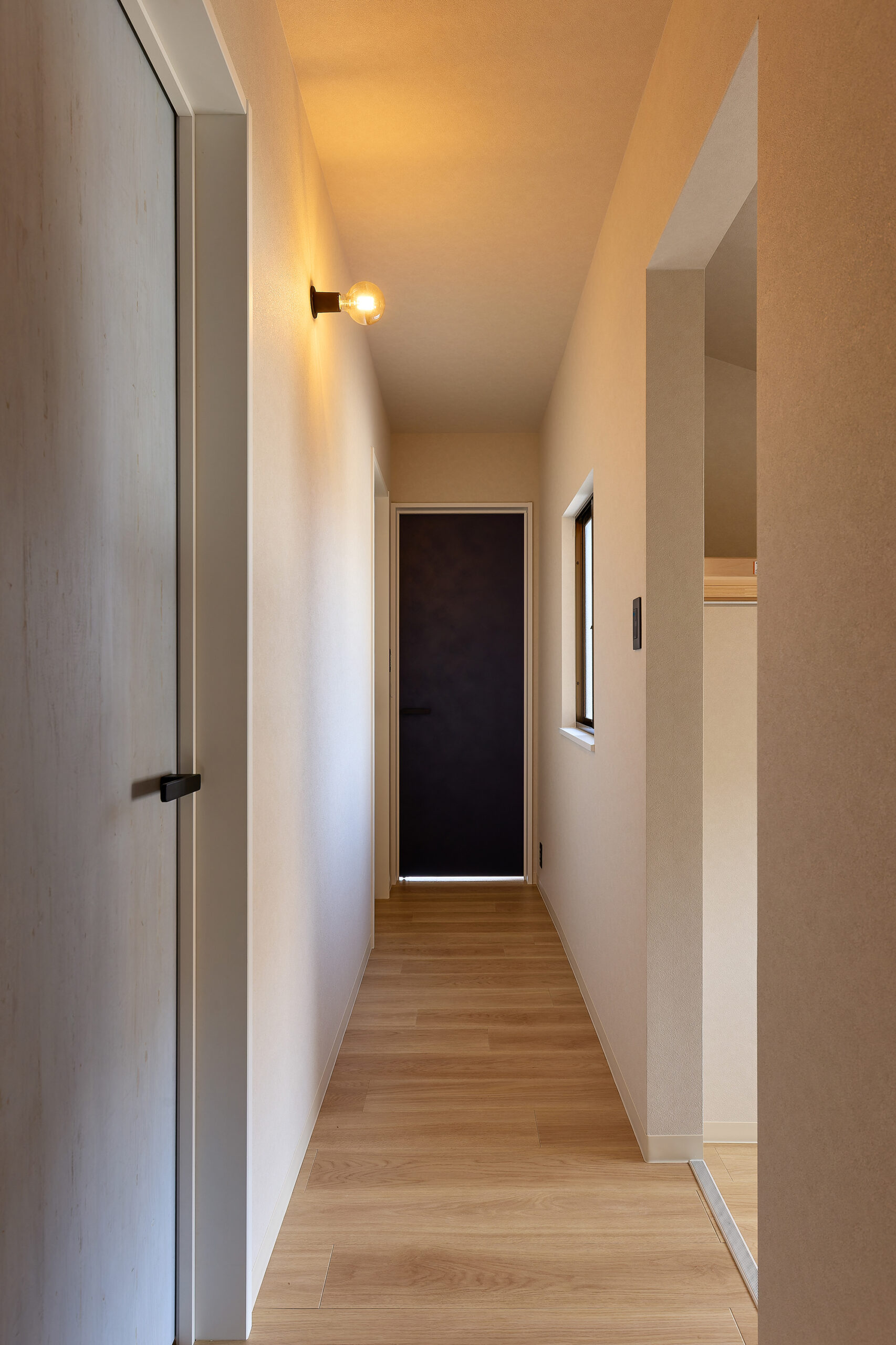 玄関ホールを抜けると光が差し込む室内窓が視線を誘い、奥行きを感じさせる抜け感を演出。