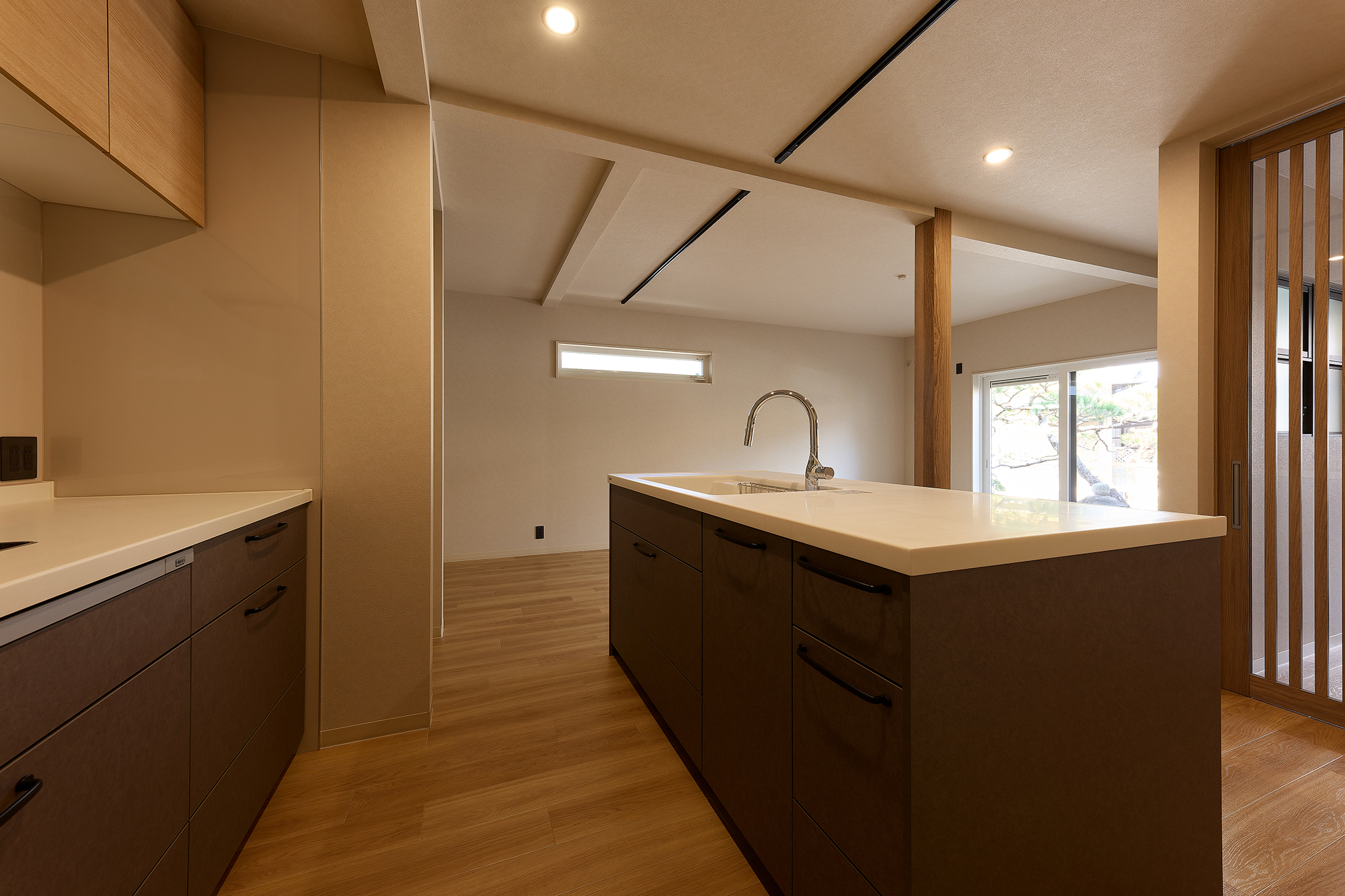 格子ドアは和の要素をモダンにアレンジし、全体のバランスを引き締めています。
