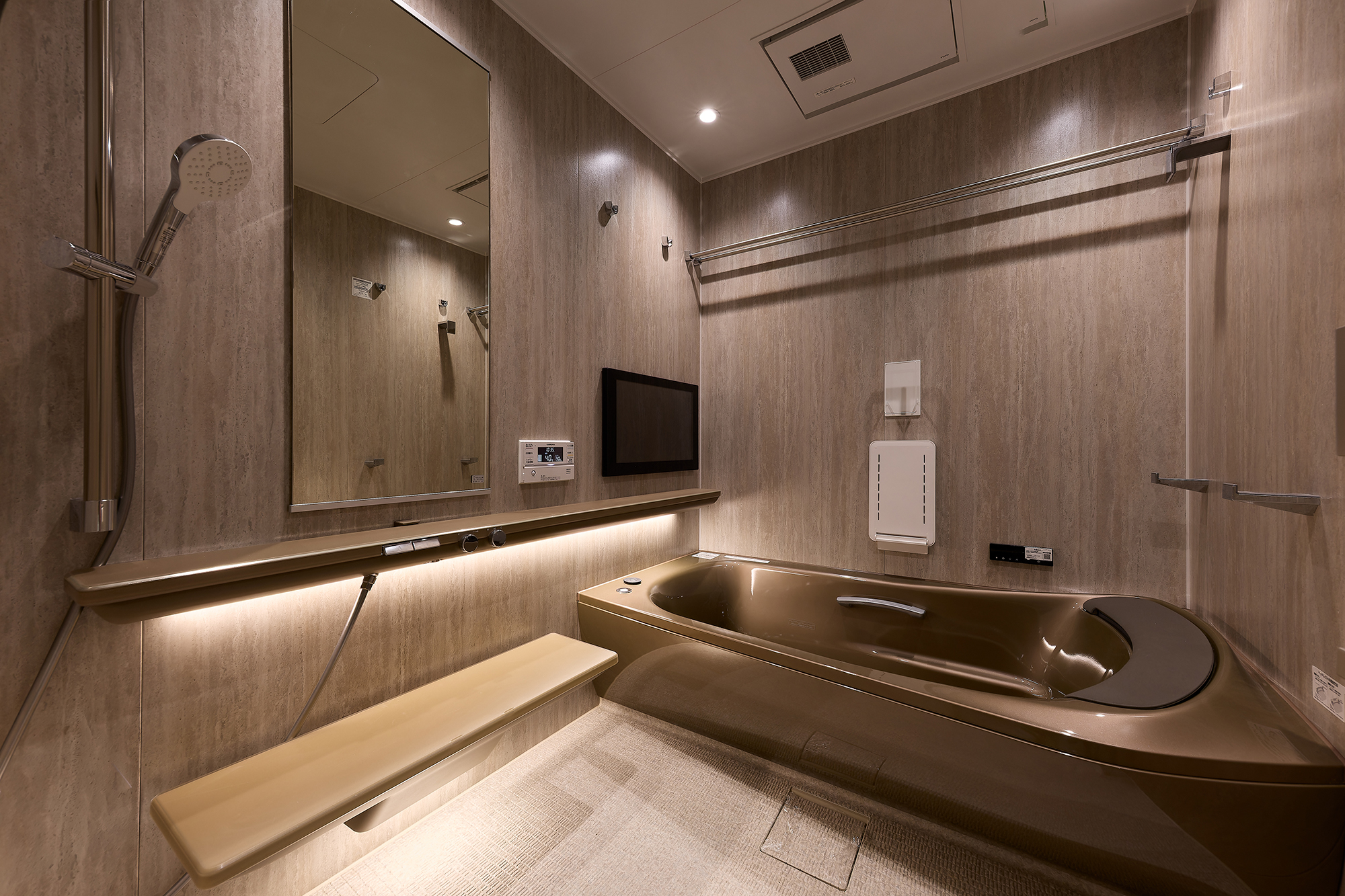 石調素材と柔らかな照明で外界を閉ざし、心身をリセットする「整う場所」に仕上げました。ゆったりお湯に浸かって視線を自分に向ける…雨降りシャワーで日常の疲れを流す時間が、ホテルスパ級の癒しに。