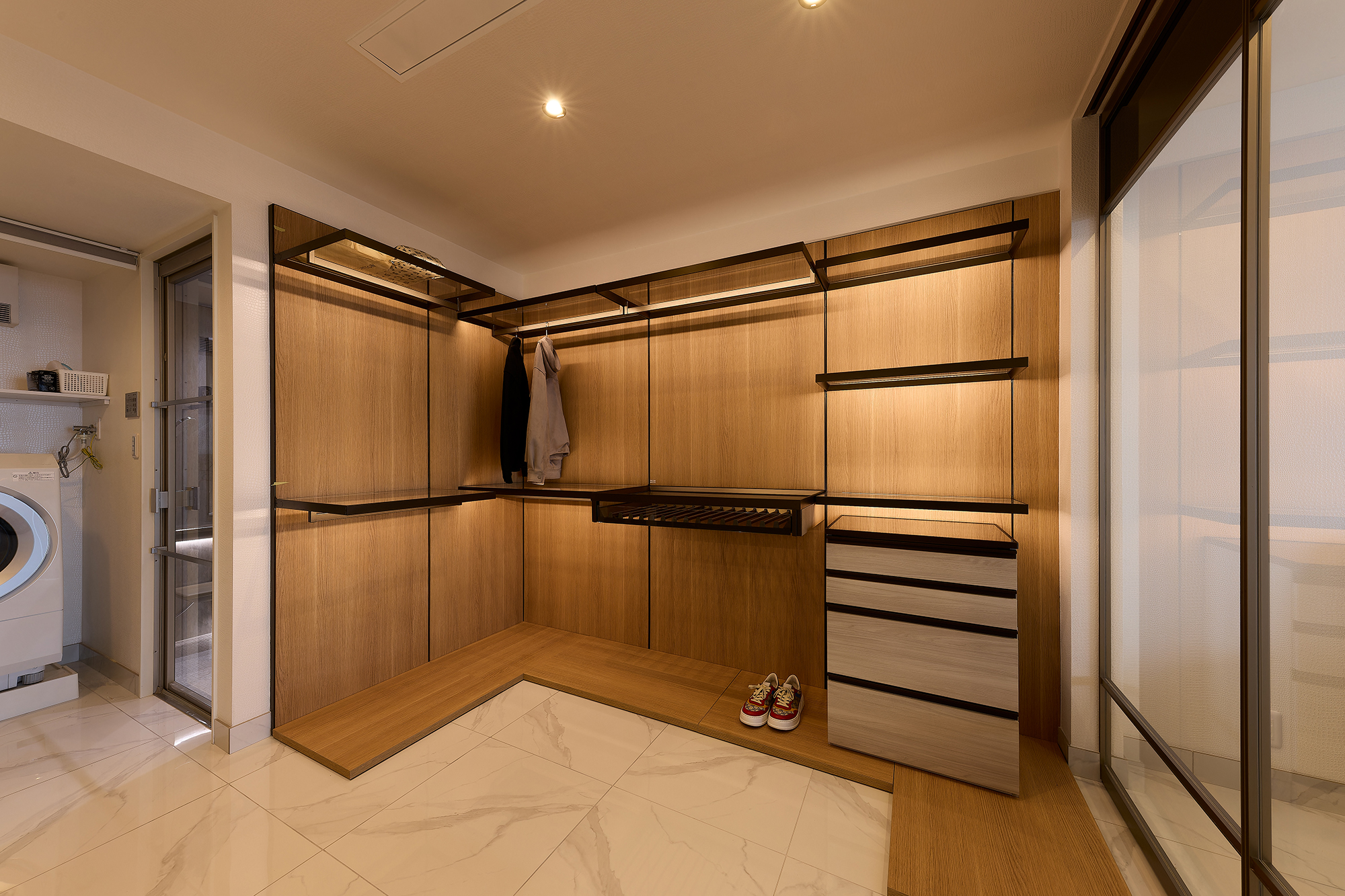 意外な隠れ家的スポットがクローク。衣服をショップ級に照らし出し、ただの収納じゃなく魅せるディスプレイ空間に大変身!