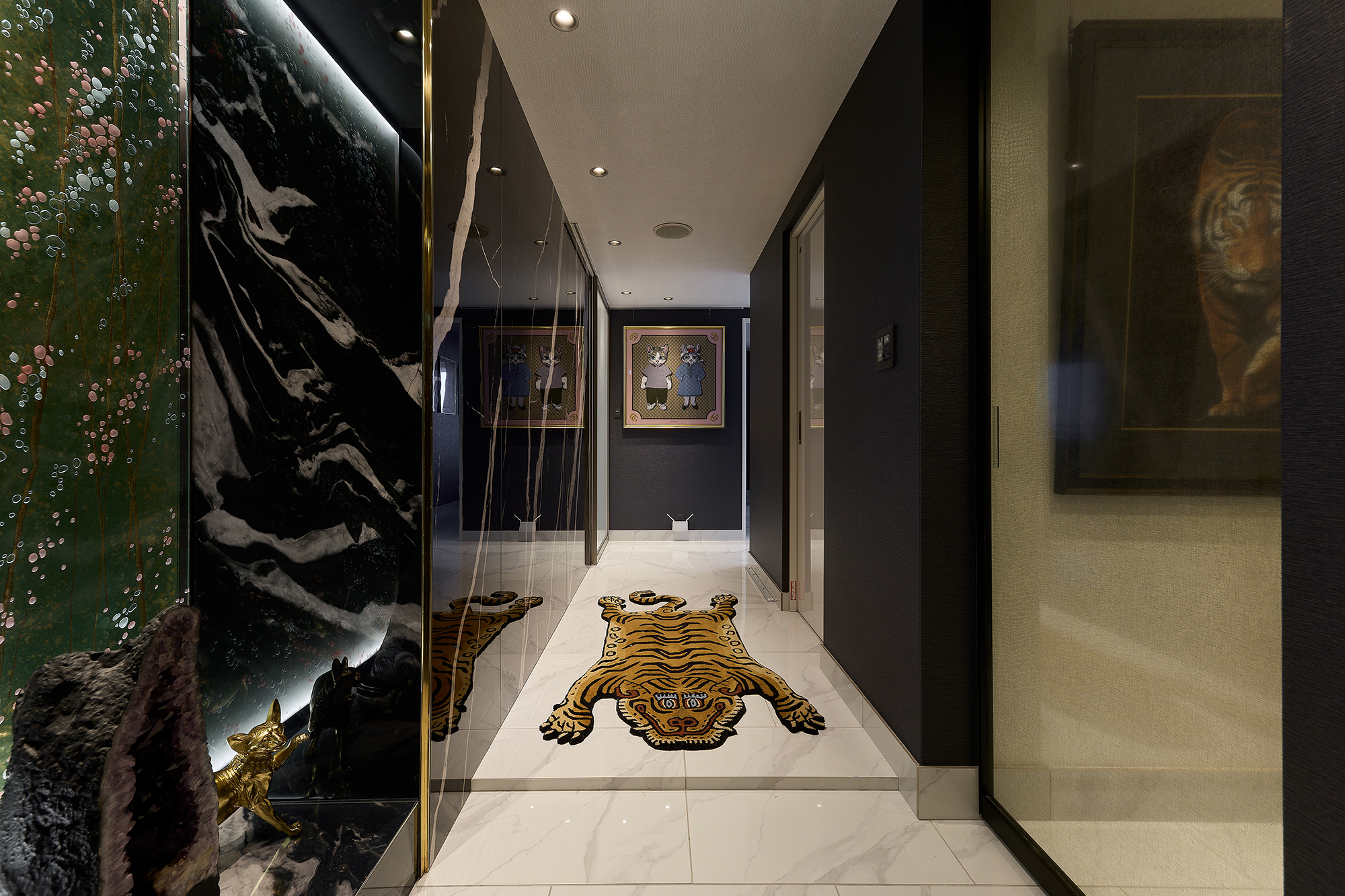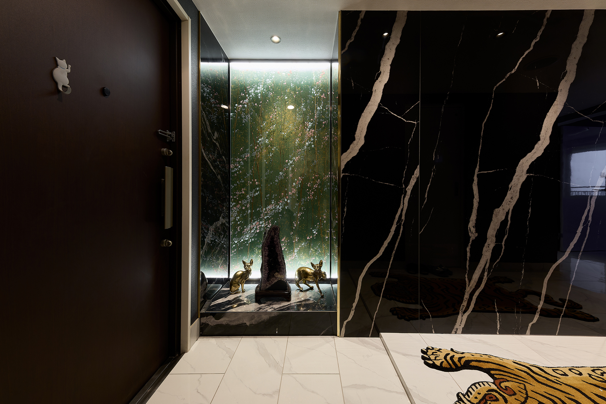 玄関の劇的インパクト→キッチンの機能美→リビングの夜景アート→バスルームの静寂→クロークの遊び心と、空間巡礼するごとに発見があって楽しいんです。上質な石調素材の陰影、照明の魔法、お施主様の猫愛が息づくモチーフ…すべてが絶妙バランスで融合し、唯一無二の高層マンション住まいが完成!