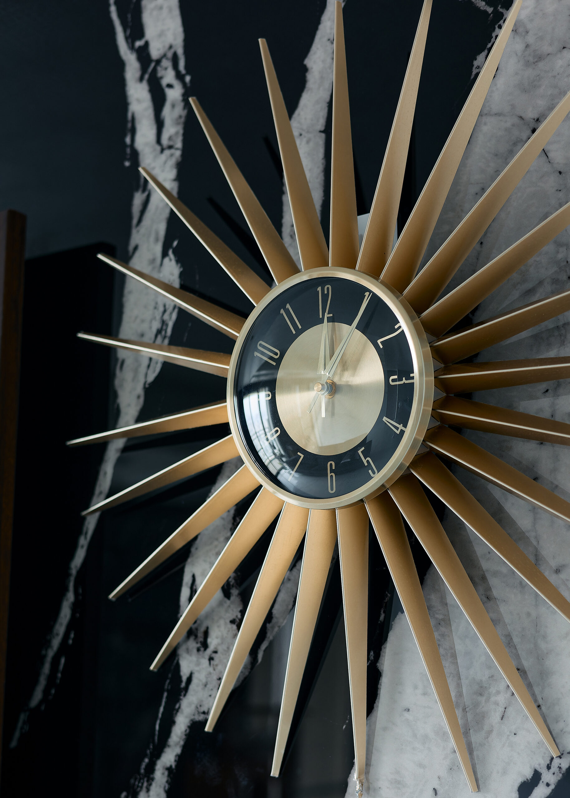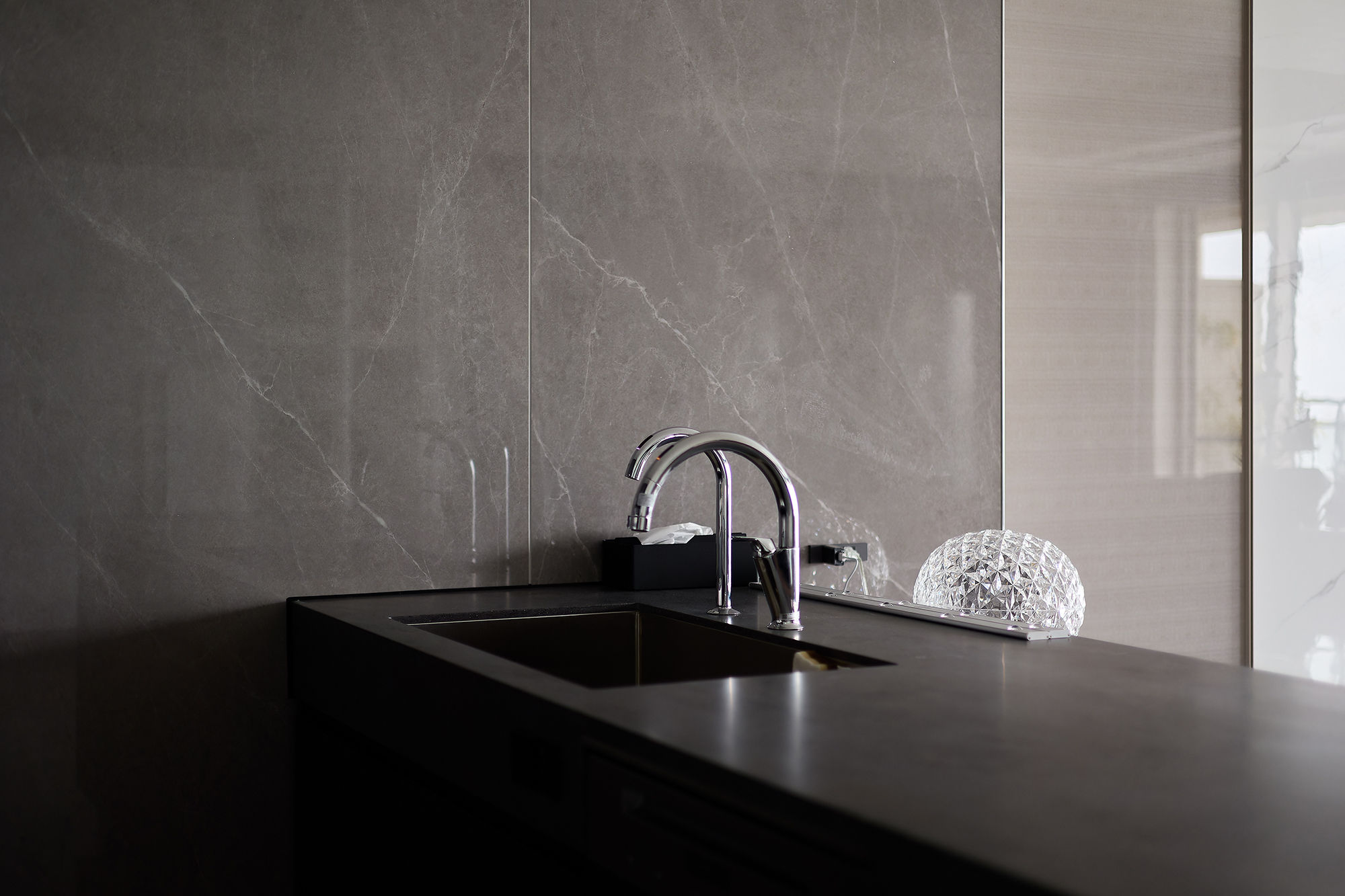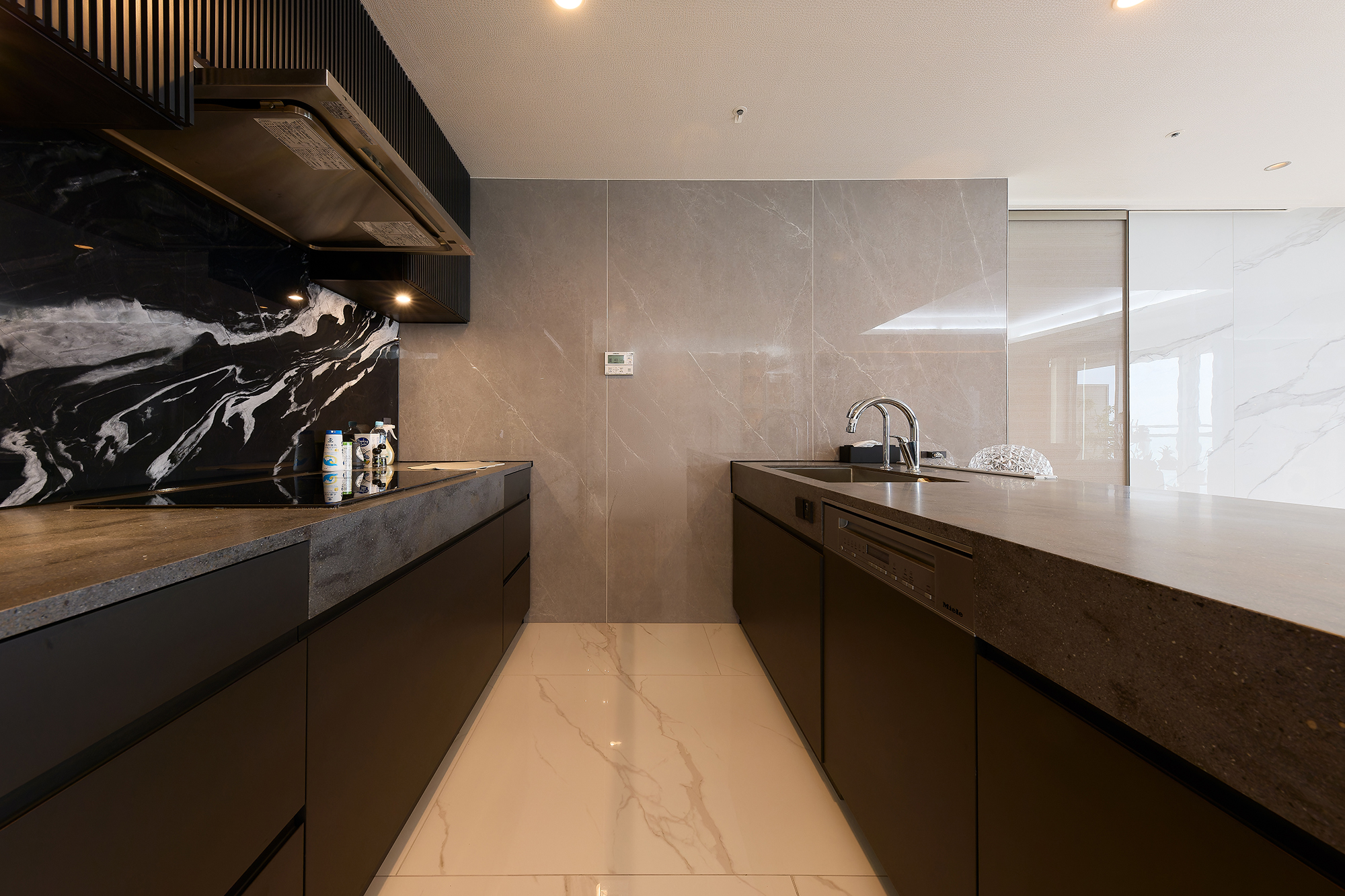 大理石調ワークトップが輝き、ブラックキャビネットでモダンに統一。