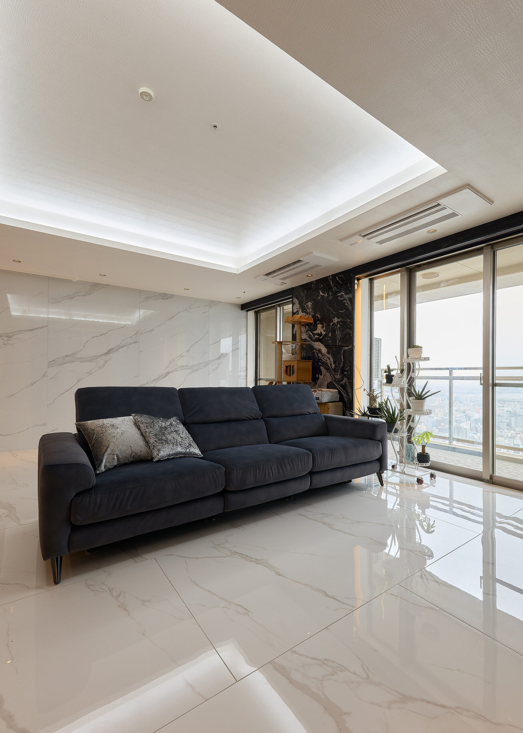 洗練された空間にさりげない遊び心が効いていて、「この家、住む人の想いが詰まってるな」と感じます。高層ならではの開放感を、猫との暮らしとマッチングさせています。
