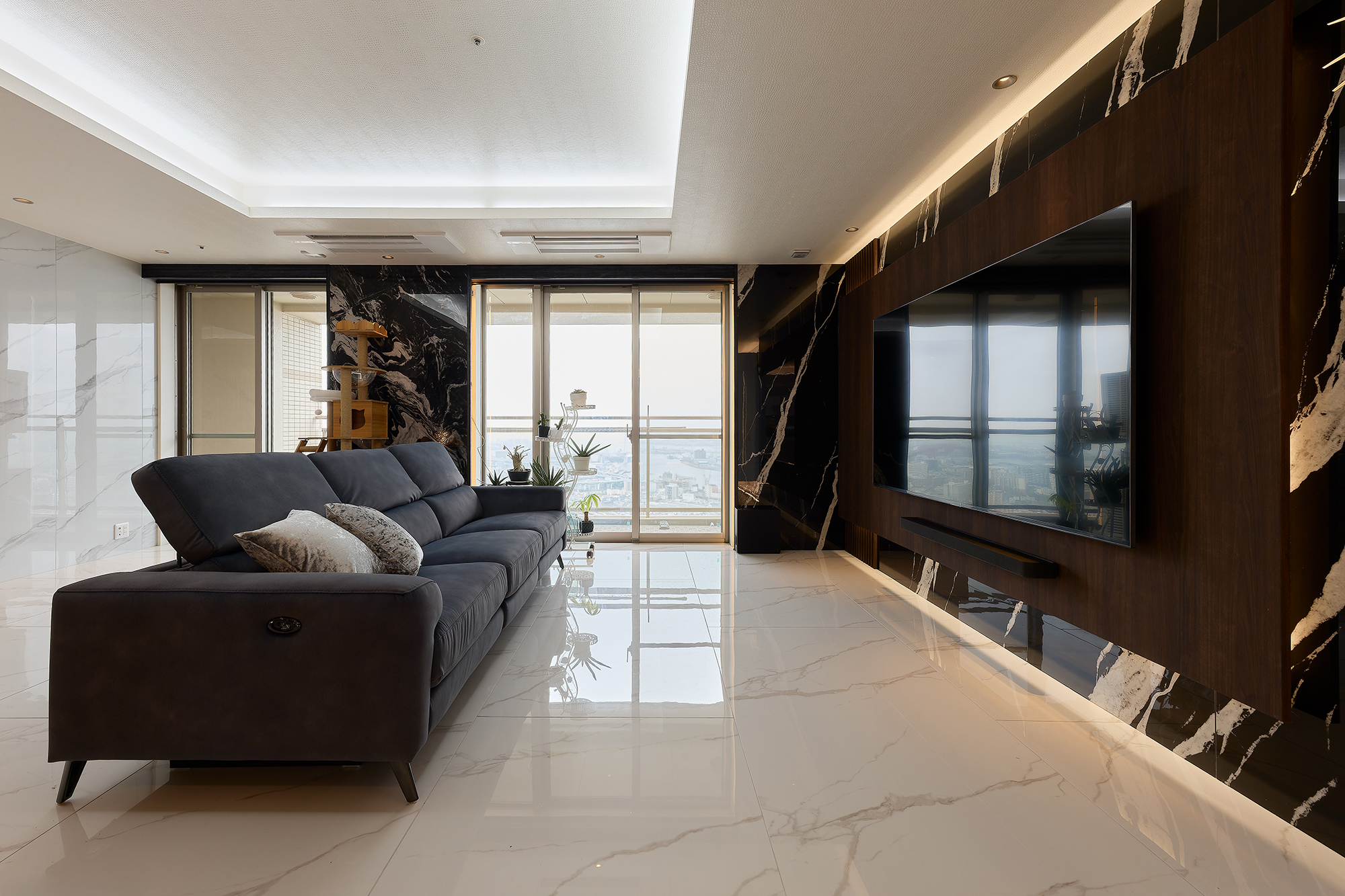 「この素晴らしい条件を活かして、都会の景色にふさわしい洗練された空間」への大胆リノベ。素材、照明、色使い、ディテールまで丁寧に見直し、高層マンションらしい開放感と上質さを両立させました。