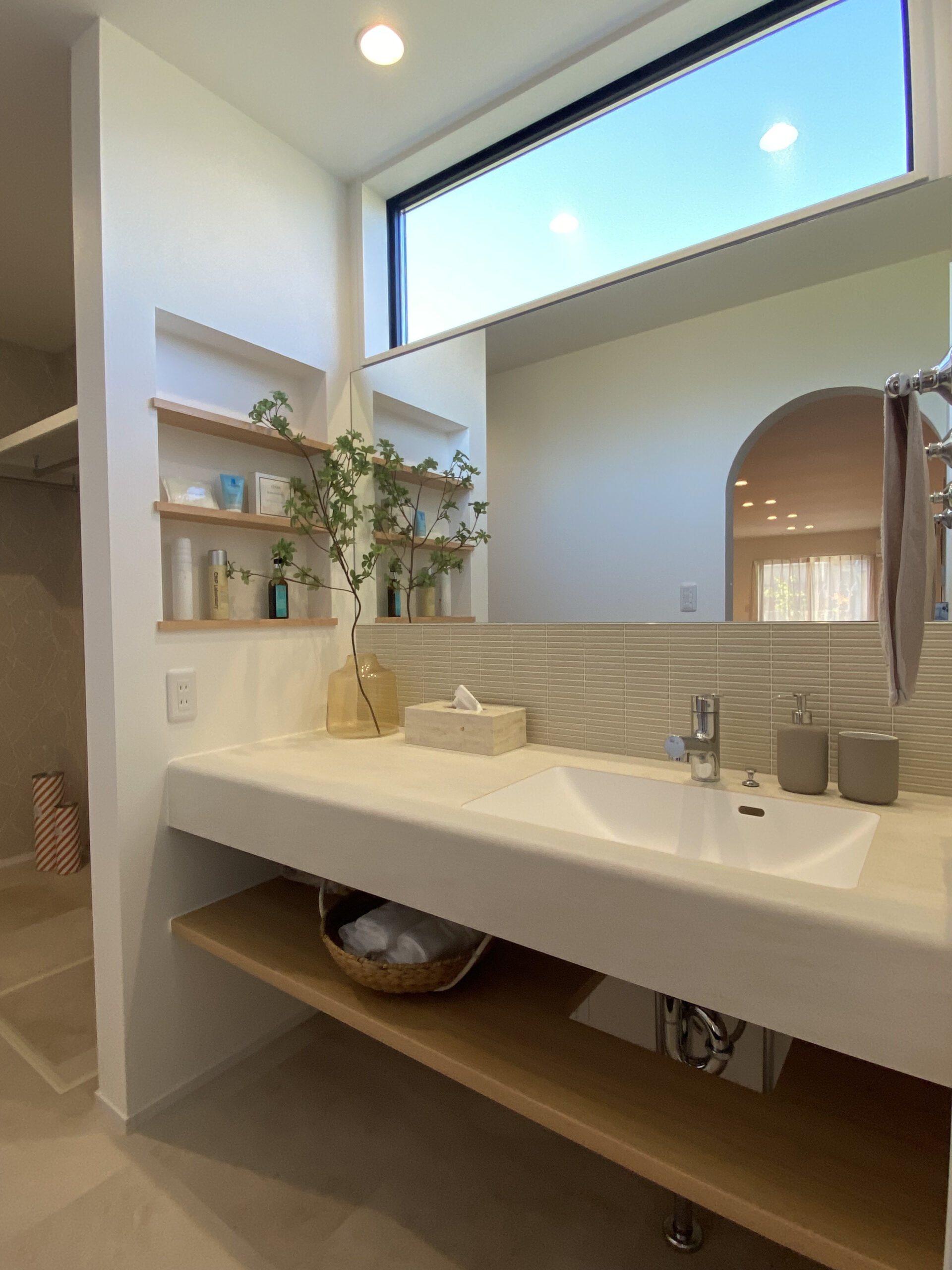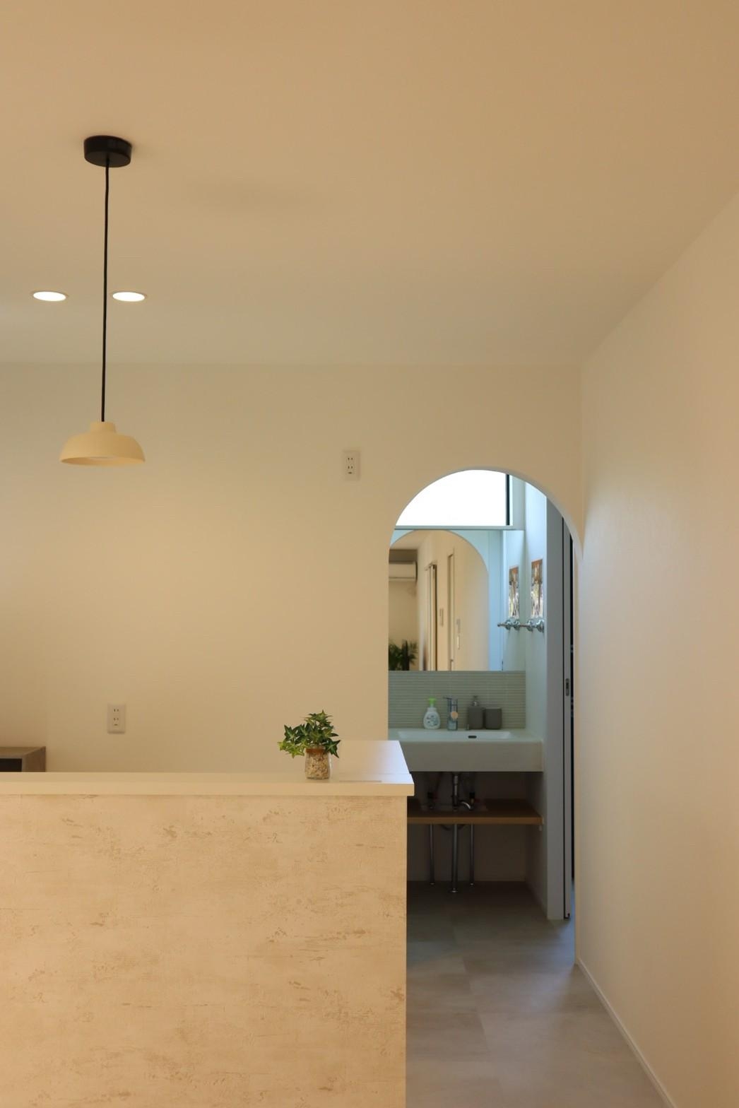 「アーチの先に広がるのは、ふたり並んで過ごす穏やかな時間。デザインと機能が美しく調和した、こだわりの洗面空間です。」