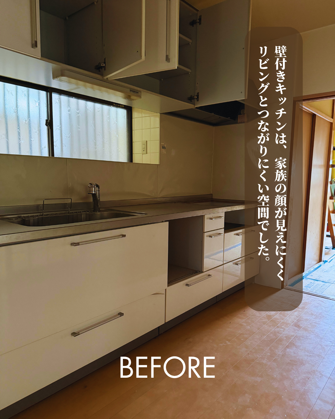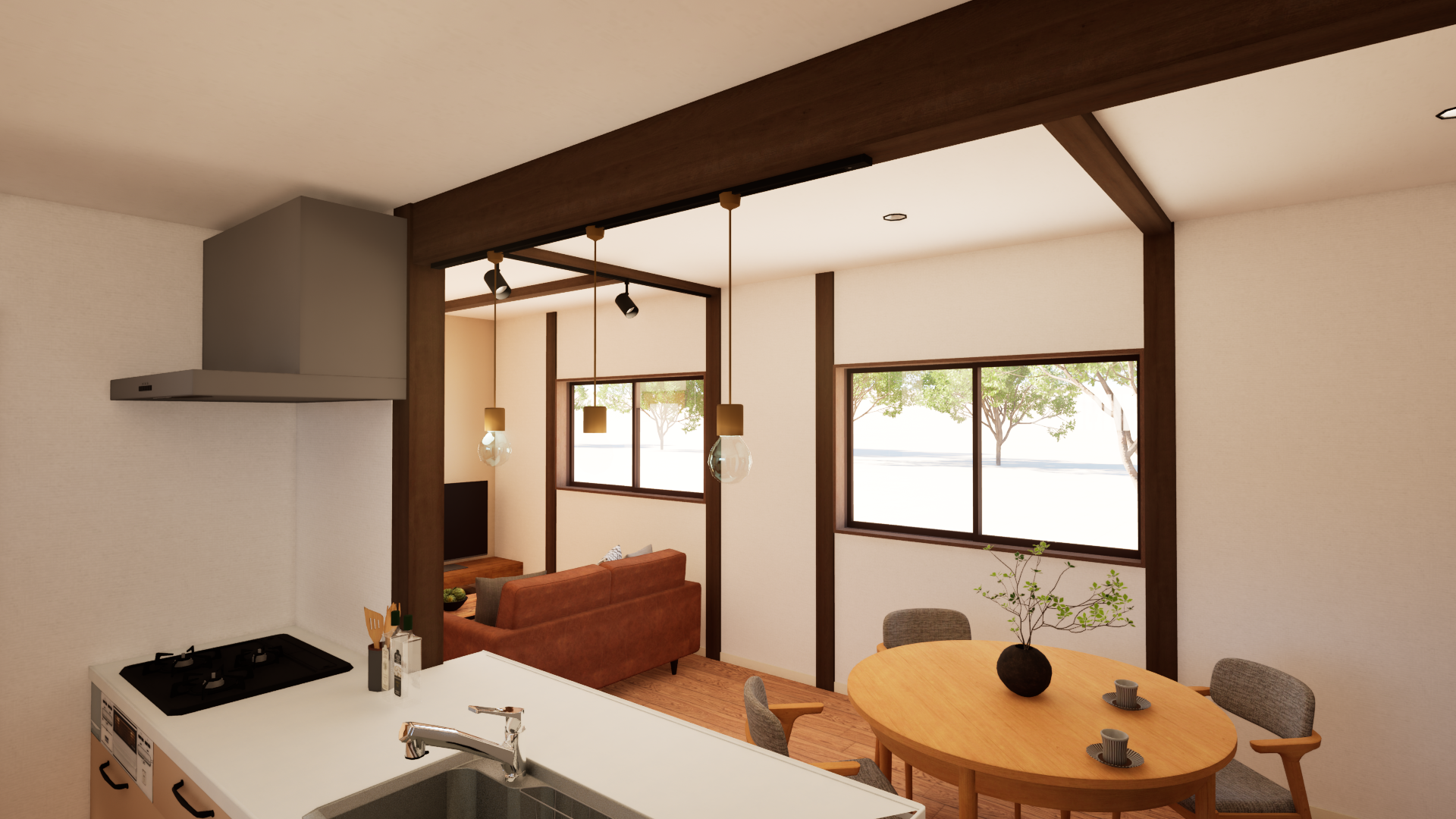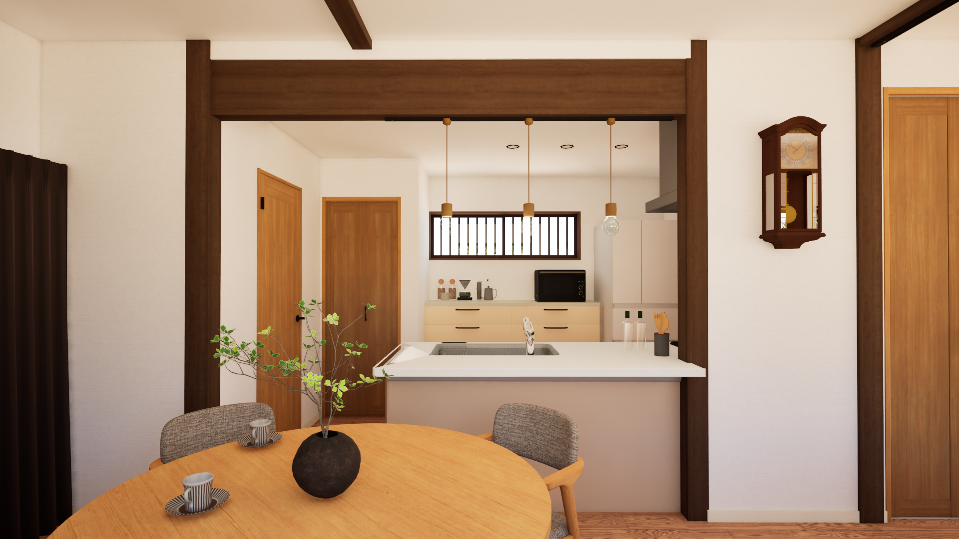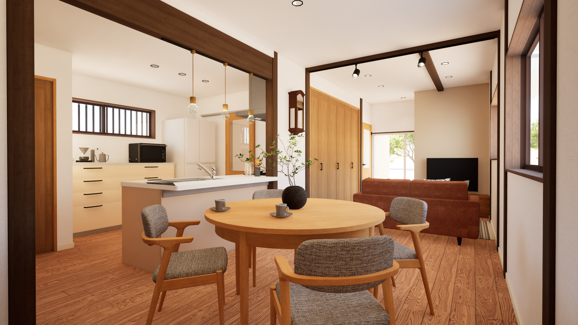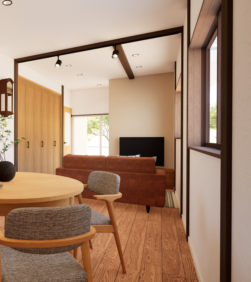 キッチンは対面式に変更し、LDK全体を見渡せる配置に。料理をしながら家族の様子を見守れる、安心感のある間取りです。