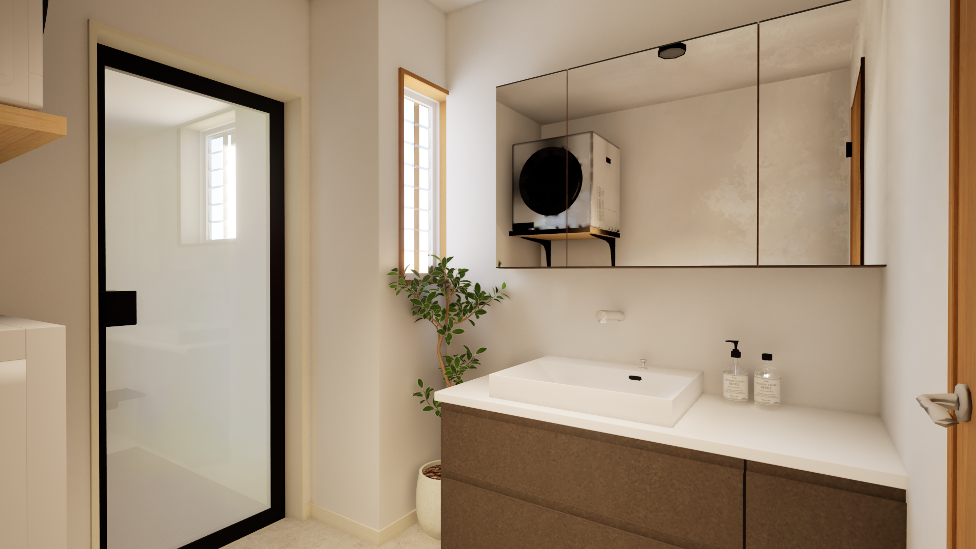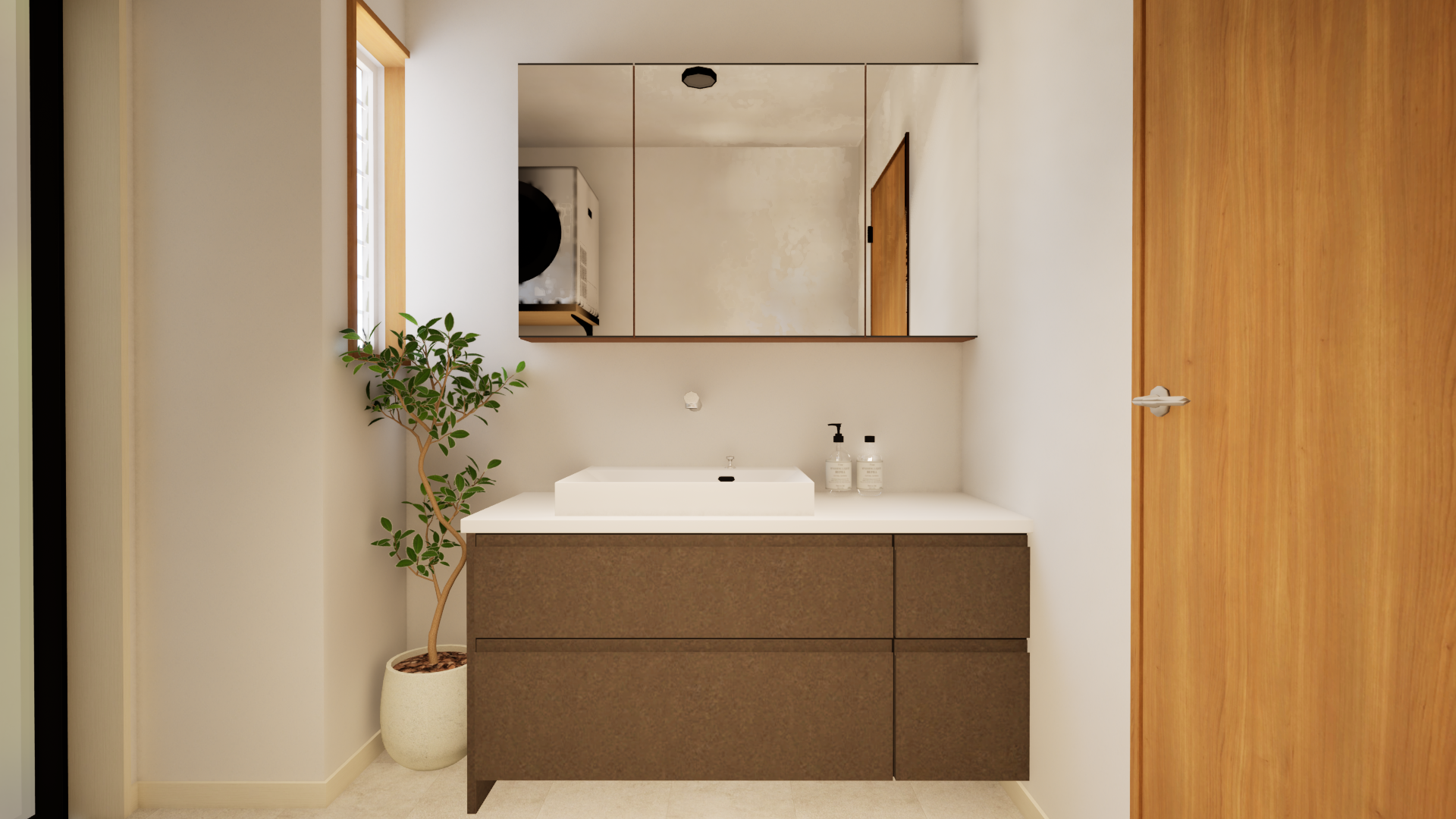 ① 家族で使えるワイド洗面台+「幹太くん」で家事効率アップ